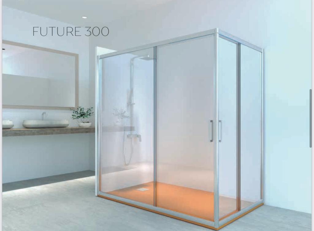 Mampara Ducha Angular Modelo Future 300 compuesta de 2 hojas correderas + 2 fijos con perfilería en aluminio cromado, cristal de 6mm de grosor y una altura de 1950mm