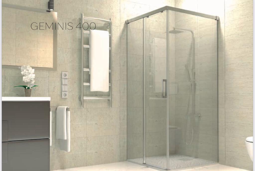 Mampara Ducha Angular Modelo Geminis 400 compuesta de 1 hoja corredera + 2 fijos con perfilería en aluminio cromado y sin perfilería en parte baja, cristal de 6mm de grosor y una altura de 1950mm